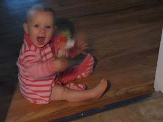 We gave her a little rattle that looks like a stick horse that makes a clip clop sound and plays a little song if you shake it just right. You can see that she is a big fan. BTW, don't you love the one leg protruding from her pj's?